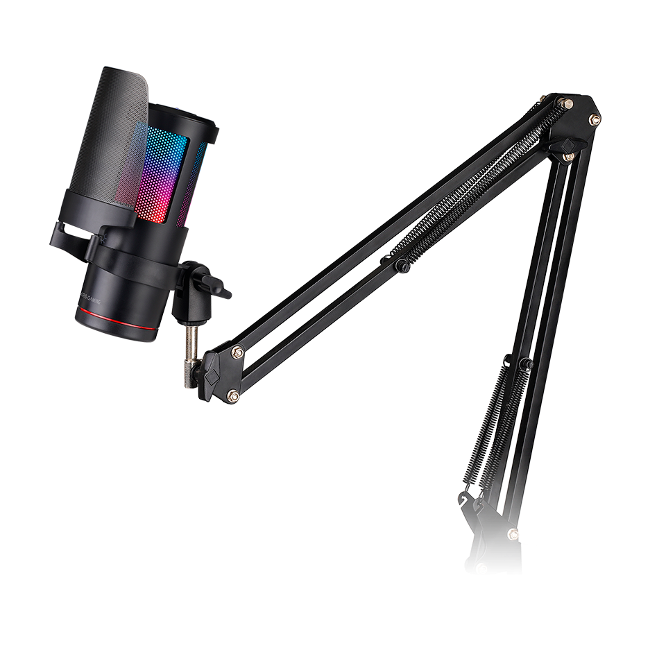 Soporte de amortiguación antivibratorio/ Filtro Pop de malla metálica/ Brazo de pluma omnidireccional/ Iluminación Dynamic ARGB Ring