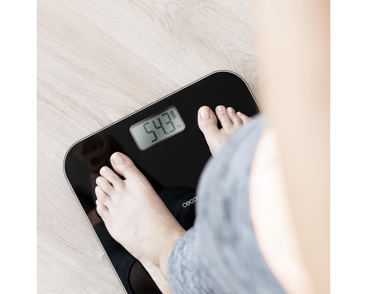 Báscula de baño de Cecotec con pulsador, superficie de vidrio templado de alta seguridad y sensores de precisión.