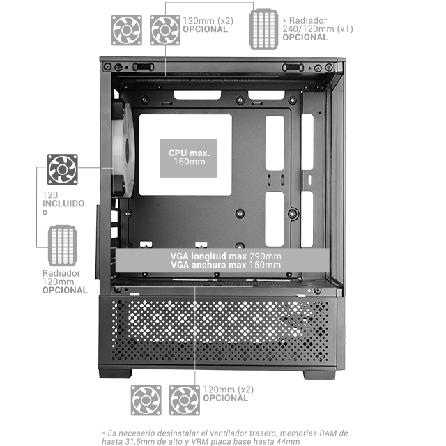 Bahias: 1x 3.5 Color Del Producto: Negro Conectores: USB 3.0 x 1, USB 2.0 x 2, Audio In/Out F.A.: No Formato: Micro ATX Formato F.A.: ATX Medidas: 388 x 197 x 304 mm Otros: Cristal templado lateral y frontal Filtro superior magnético Ventilador trasero con iluminación FRGB