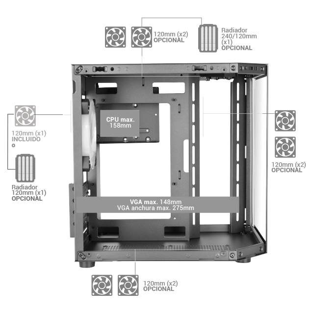 337×276×342 mm / 3.5 Kg / Cristal Templado / RGB Fijo / MicroATX - Mini-ITX / USB3.0 + USB2.0 / 275 mm VGA / Hasta 7 Ventiladores