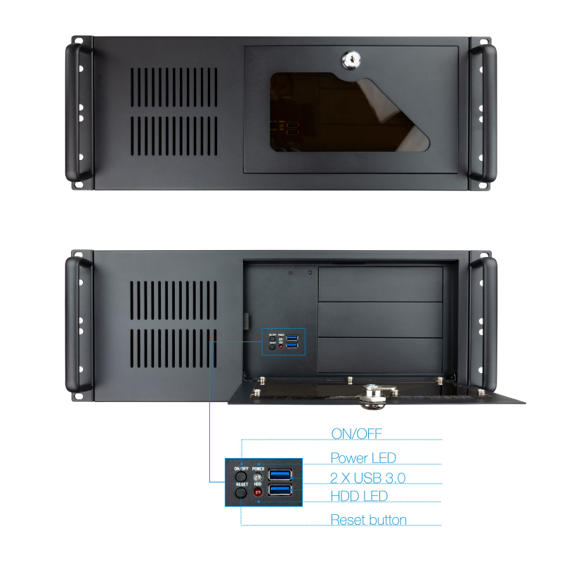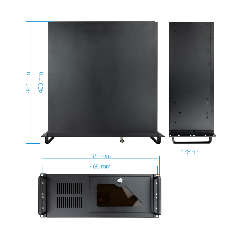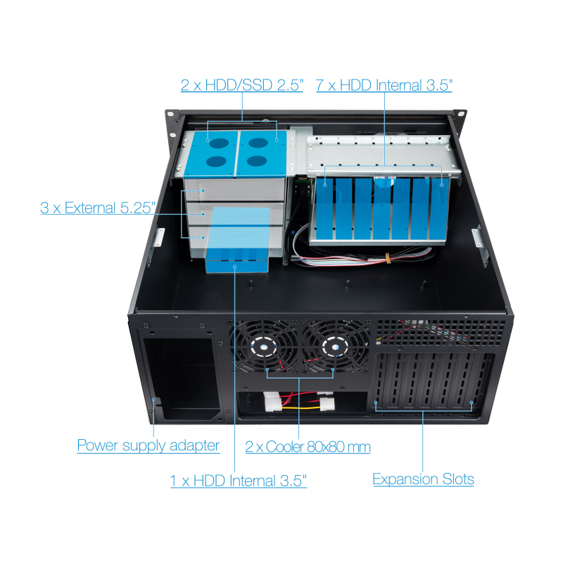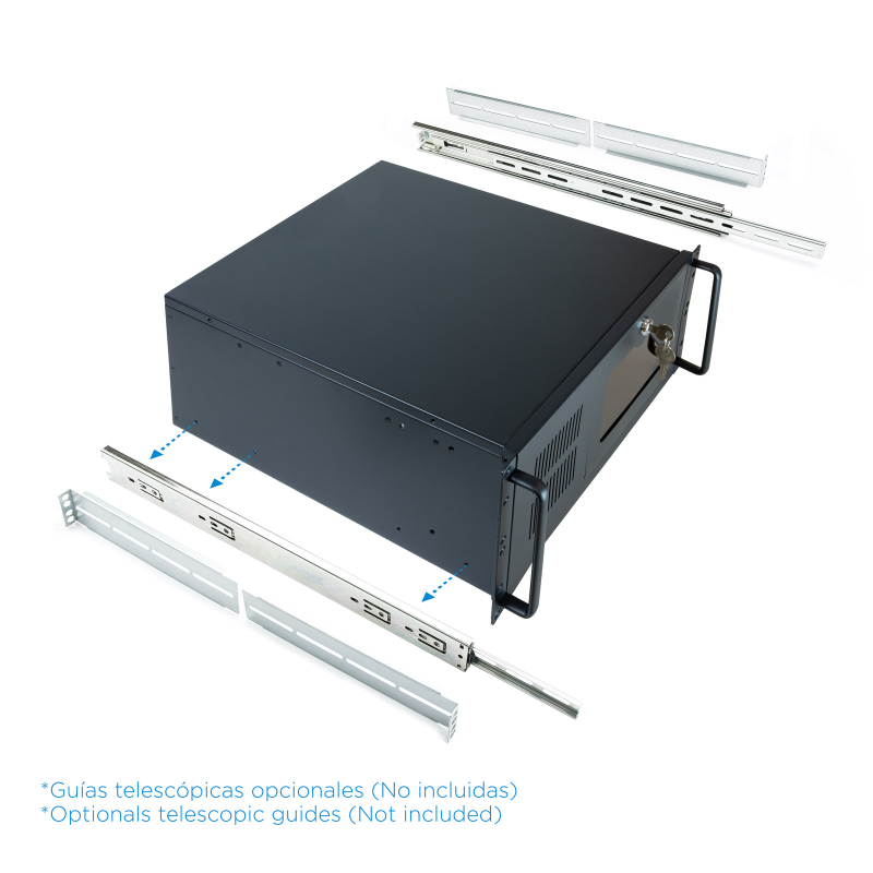 19" 4U/Bahías: 3x5'25 externa / 8x3'5, 2x2'5 internas/ Medida: 485 x 178 x 482 mm