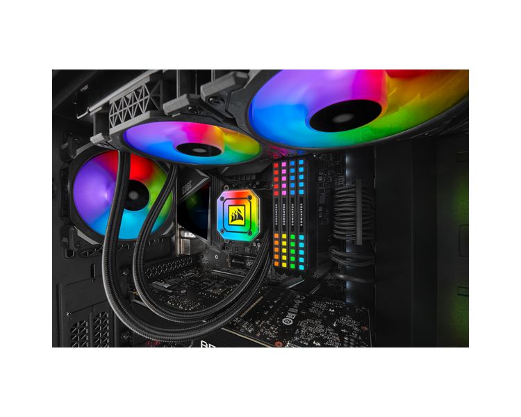 Incluye dos ventiladores CORSAIR AirGuide de 120 mm, con aspas antirremolinos que concentran el flujo de aire y mejoran la refrigeración.