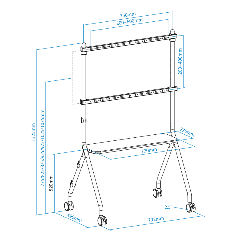 Colocación soporte: Suelo movil Color Del Producto: Blanco Peso Maximo: 50kg Pulgadas Desde: 49 Pulgadas Hasta: 80 Vesa: 600x400