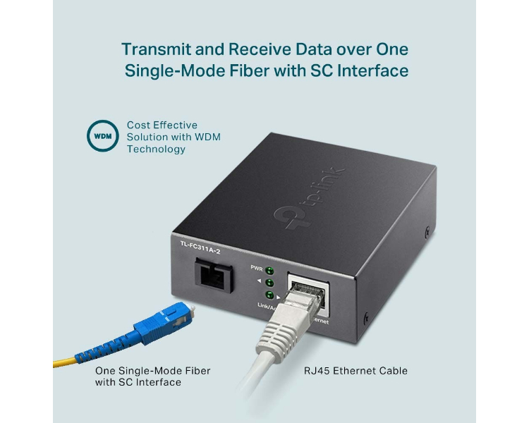 TL-FC311A-2 adopta la tecnología WDM (multiplexación por división de longitud de onda), que ayuda a enviar y recibir datos a una distancia de hasta 2 km con solo una fibra monomodo, lo que ahorra la mitad del costo de implementación del cable para los clientes. TL-FC311A-2 transmite datos a una longitud de onda de 1550 nm y recibe datos a una longitud de onda de 1310 nm en fibra óptica. Por lo tanto, el dispositivo terminal utilizado junto con el TL-FC311A-2 debe enviar datos a una longitud de onda de 1310 nm y recibir datos a una longitud de onda de 1550 nm. TP-Link otro convertidor de medios TL-FC311B-2 es uno de los productos que pueden cooperar con TL-FC311A-2.