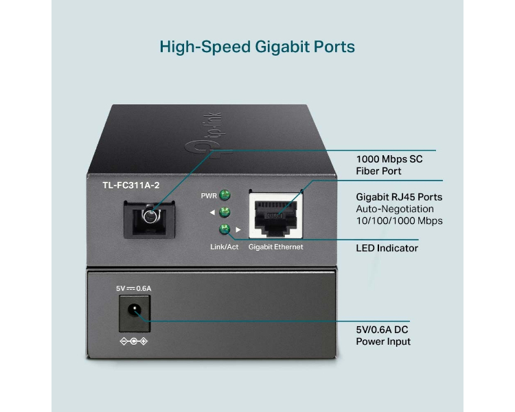 Además, este convertidor de medios se puede usar como un dispositivo independiente (no se requiere rack) o con el rack TL-FC1420 de TP-Link para auto MDI / MDI-X en el puerto TX en el que el modo dúplex se negocia automáticamente.